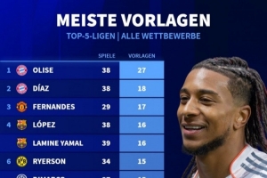 體育資訊3月21日訊 德國轉(zhuǎn)會市場統(tǒng)計了五大聯(lián)賽球員本賽季各賽事的助攻次數(shù),并列出榜單,奧利塞27助斷層居首。