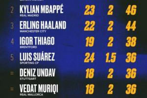 以下為歐洲金靴積分榜排行: