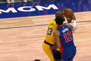 GIF-詹姆斯轉身跳投被吹犯規 活塞挑戰 變為不犯規且詹姆斯出界