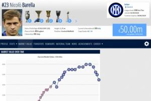 自2024年年底以來,巴雷拉的身價一路從生涯最高的8000萬歐跌到7500萬、6500萬歐、6000萬歐以及今天的5000萬歐。目前巴雷拉的身價仍排在意大利籍球員第三,意甲球員第六,國米隊內第三。