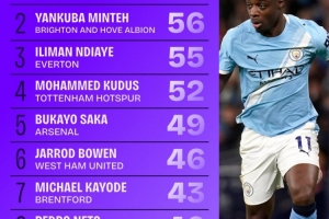 以下為本賽季英超過人數(shù)排行:
