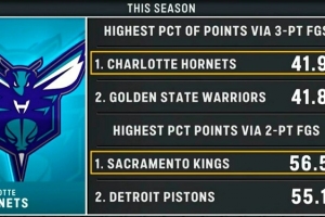 三分命中數(shù)占比:黃蜂41.9%第一,勇士41.8%第二