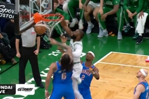 GIF-杰倫·布朗單臂隔扣,疑似大拇指割喉動作慶祝