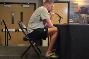 賽后,約基奇出席新聞發布會,腳踩一雙小黃人拖鞋,反差萌拉滿。