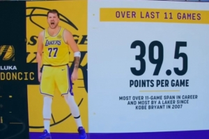據統計,連續11場比賽場均39.5分創造了東契奇生涯最高紀錄,也是湖人隊史繼2007年科比以來最高!