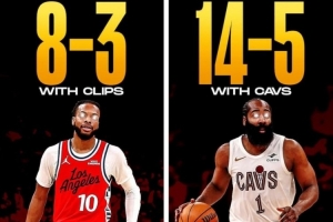 哈登出戰(zhàn)時(shí),騎士隊(duì)14勝5負(fù)。