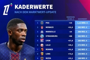 體育資訊3月28日訊 德國轉會市場更新了法甲球員的身價,并列出法甲球隊身價排名,巴黎12.2億歐斷層居首,摩納哥3.92億歐次席。
