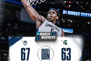 體育資訊3月28日訊 NCAA瘋三16進8,康涅狄格大學67-63險勝密歇根州立大學,晉級16強。