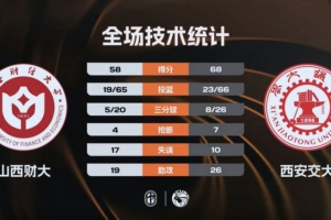 末節比賽,西安交大的進攻表現有所回落,前七分鐘的時間里只拿到6分,這也給了山西財大追分的機會,分差最小時僅剩3分,但之后她們一分未得,西安交大連拿7分穩住局勢,韓晴更是命中壓哨三分球,最終西安交大68-58力克山西財大奪得西北王。
