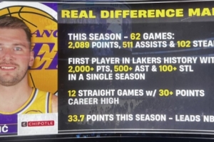 湖人VS奇才,轉播方曬出東契奇賽季數據: