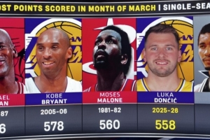 本場比賽過后,東契奇三月(當(dāng)?shù)貢r間)總得分達(dá)到600,是喬丹(676分)之外歷史上唯一在三月份總得分600的球員。