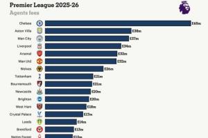 英超球隊經紀人費用:切爾西6500萬鎊領跑,維拉、曼城利物浦前四