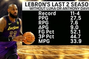 媒體oh he didn't列舉出湖人球星詹姆斯最近兩個(gè)賽季以來(lái)在東契奇或者安東尼·戴維斯缺陣時(shí)的表現(xiàn):
