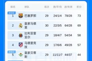 體育資訊4月5日訊 今日西甲,皇馬客場1-2爆冷不敵保級球隊馬略卡,最新積分榜如圖,北京時間凌晨三點巴薩將客戰(zhàn)馬競。