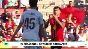 隨后Movistar的鏡頭捕捉到馬菲奧用手向維尼修斯比劃著球的手勢(shì),還喊出了“沙灘”的詞匯,此前西班牙的多座體育場(chǎng)都曾響起過針對(duì)維尼修斯的這條口號(hào)。