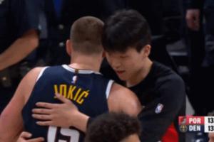 GIF-約基奇看到了楊瀚森 過(guò)去兩個(gè)人愛(ài)的抱抱