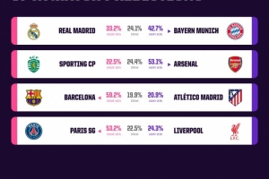 Opta超算預(yù)測(cè)歐冠1/4決賽首回合: