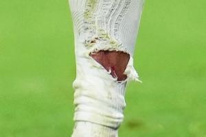 賽后照片顯示,姆巴佩小腿襪被踩破露出血痕。