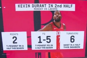 破不了夾擊!杜蘭特2助7失誤 下半場(chǎng)僅在垃圾時(shí)間得2分!