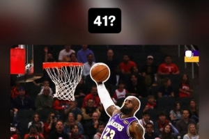 賽后,拉拉維亞轉(zhuǎn)發(fā)了詹姆斯的一張騰空海報,并寫道:“41歲?”